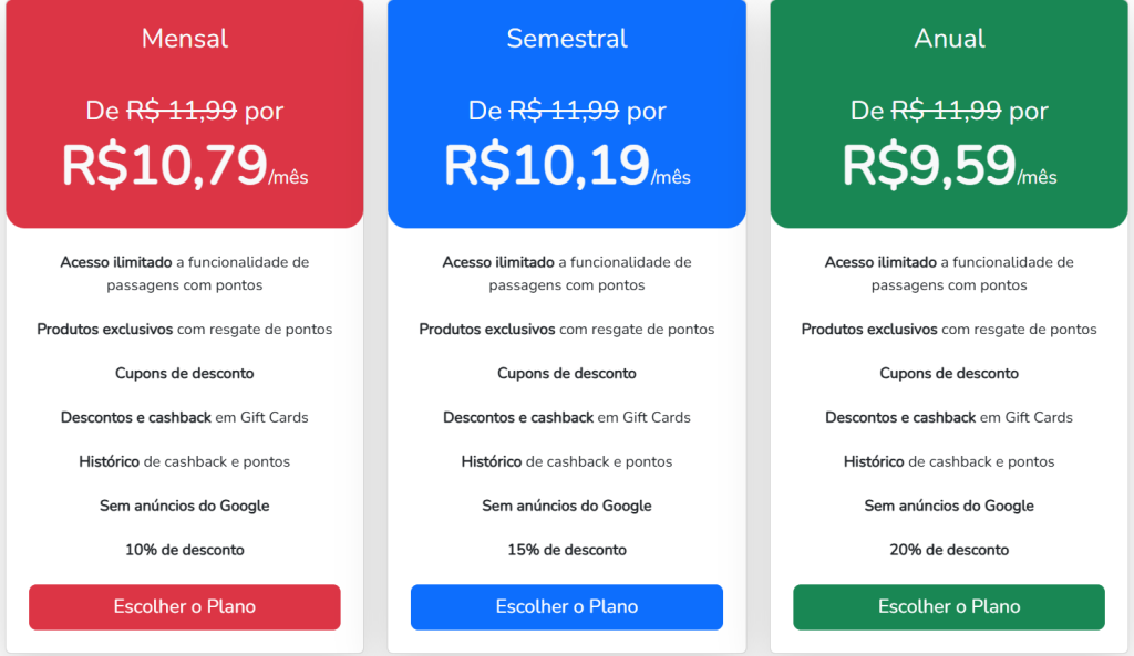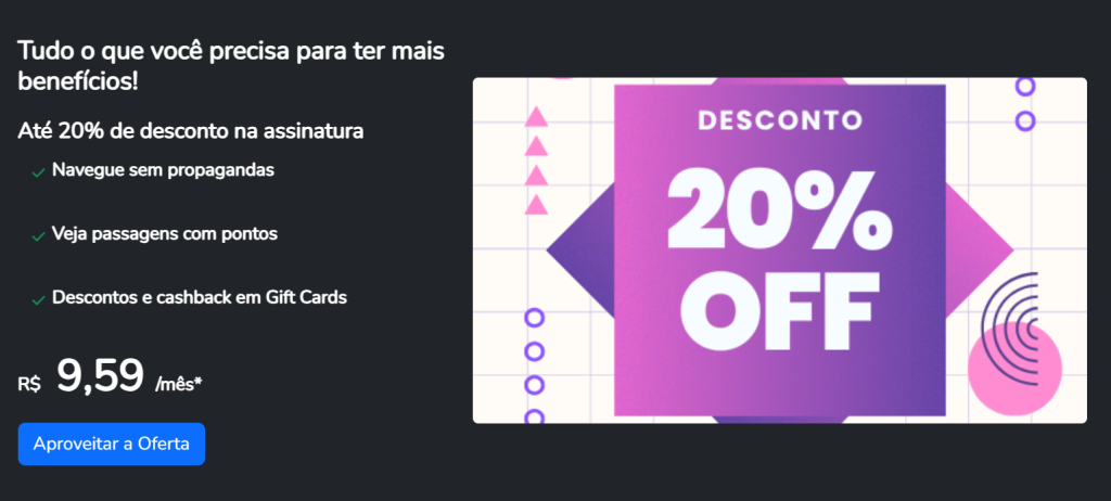 Ao assinar, você ganha acesso a funcionalidades únicas, como passagens por pontos, descontos em gift cards e histórico detalhado de seus ganhos. Além disso, a navegação sem anúncios torna a experiência mais rápida e focada no que realmente importa: suas economias.
