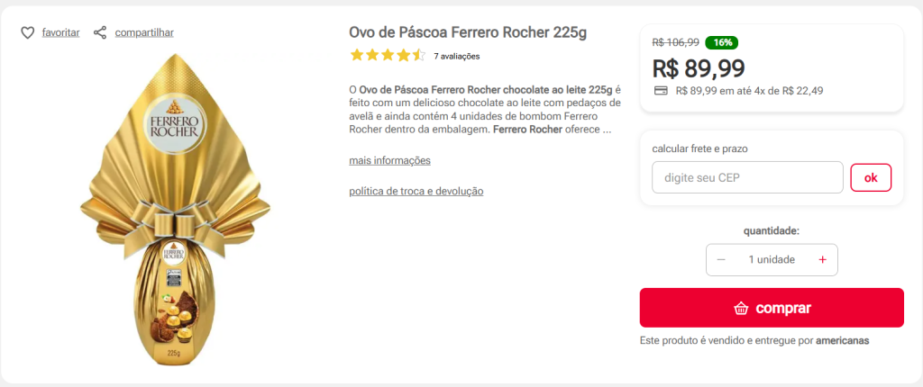 Só para exemplificar, ao comprar um Ovo de Páscoa Ferrero Rocher 225g a R$ 89,99, com a promoção citada acima você pouparia 7% do valor gasto.