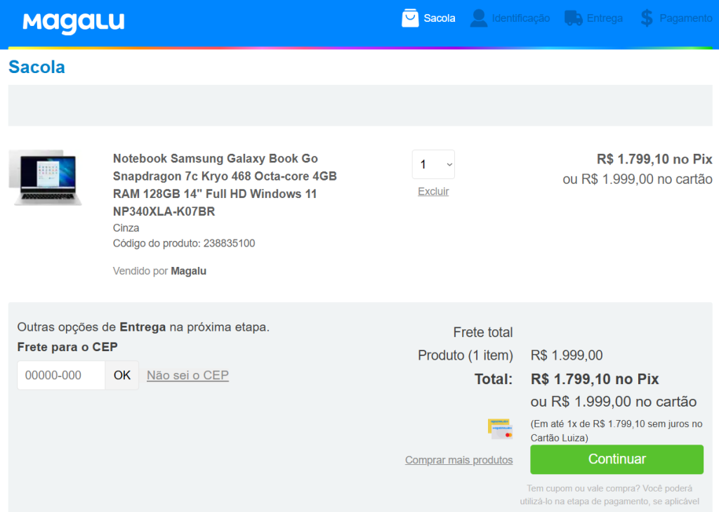 - Compre normalmente no site do Magalu, escolhendo os produtos desejados.