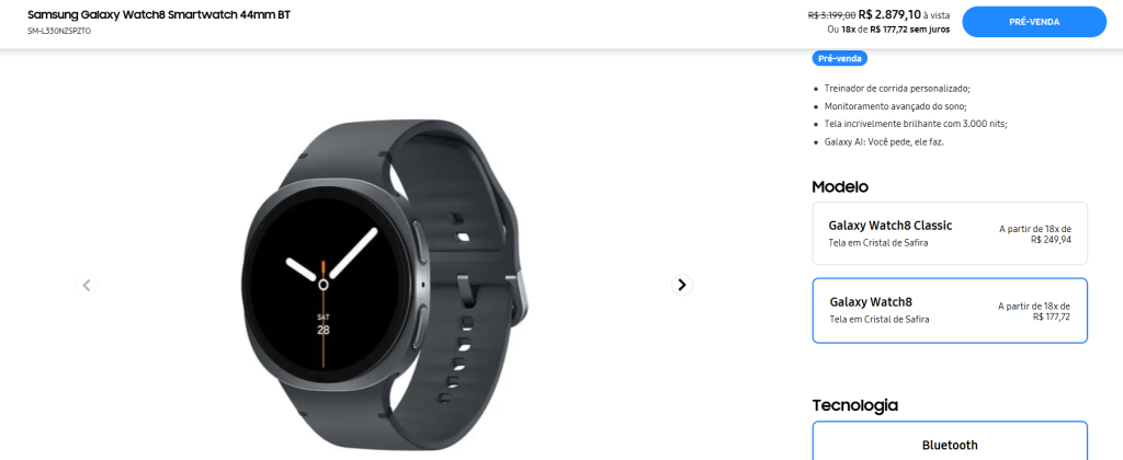 Tecnologia e praticidade no pulso. A Samsung está lançando o novo Samsung Galaxy Watch8 Smartwatch 44mm BT com 10% de cashback em uma parceria entre Samsung e Méliuz. Ou seja, é ideal para pais conectados e ativos.