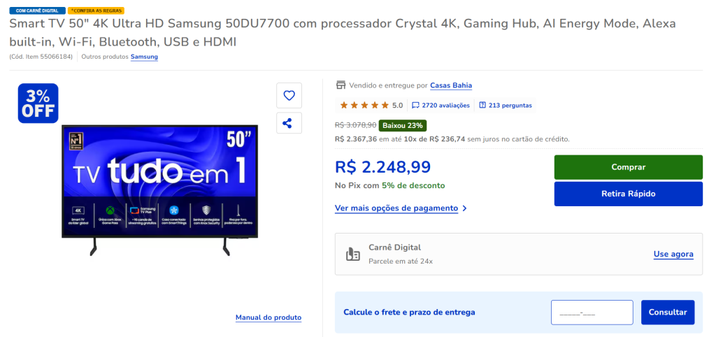 Ou seja, com o Cashback, a Tv passa a custar R$ 2.248,99