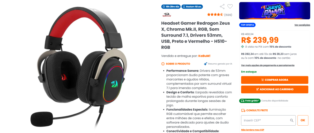 Ao utilizar essa promoção o valor do produto passa a ser R$ 215,99, ou seja 10% de cashback.