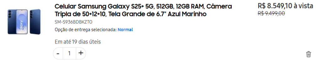 Na compra de um Celular Samsung Galaxy S25+ 512 GB, é possível salvar R$ 1.282,36. Assim, guardando um dinheiro para uma ocasião futura. Com o preço final do produto ficando em R$ 7.266,73.