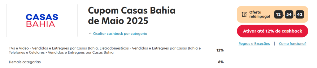 Para exemplificar, escolhemos uma promoção para mostrar como o cashback funciona. A promoção escolhida foi em parceria com a Casas Bahia com 12% de cashback nas seguintes categorias: TVs e Vídeo – Vendidos e Entregues por Casas Bahia, Eletrodomésticos – Vendidos e Entregues por Casas Bahia e Telefones e Celulares – Vendidos e Entregues por Casas Bahia e 6% de cashback nas demais categorias.