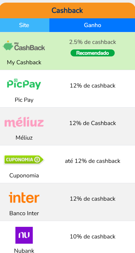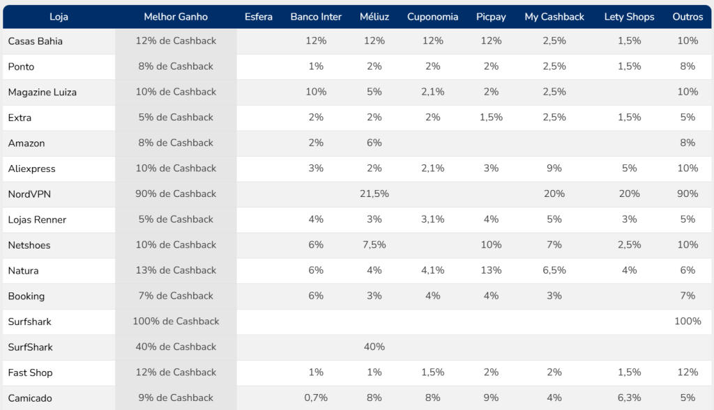 Essa porcentagem varia de acordo com a loja e o tipo de produto. Por exemplo: em uma loja parceira como a Casas Bahia, você pode receber até 10% de volta. Em outras promoções especiais, como a Samsung ou Natura, o valor pode ser ainda maior.
