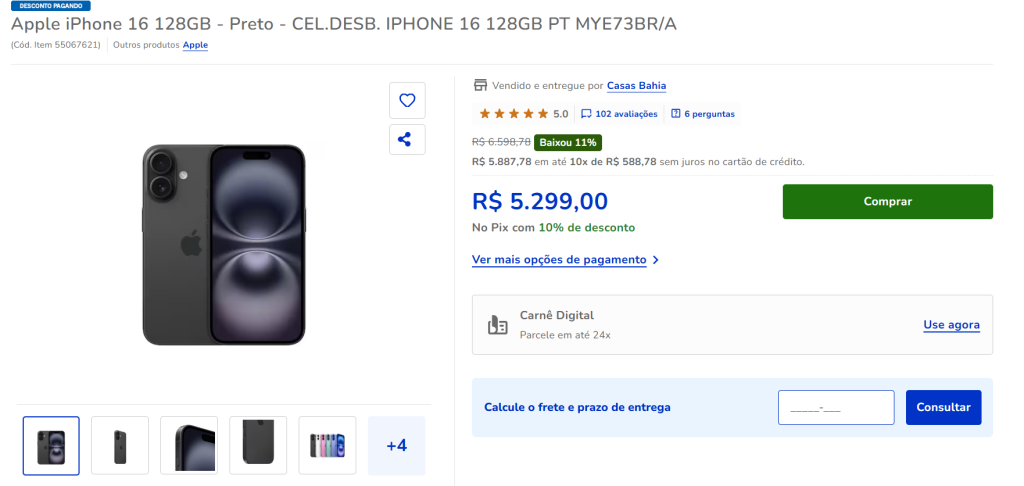 Por exemplo, ao comprar esse Apple iPhone 16 128GB por R$ 5.299,00 é possível resgatar 12%, ou seja, o equivalente a R$ 638,88. Assim, o preço final do produto ficaria em torno de R$ 4.660,12.