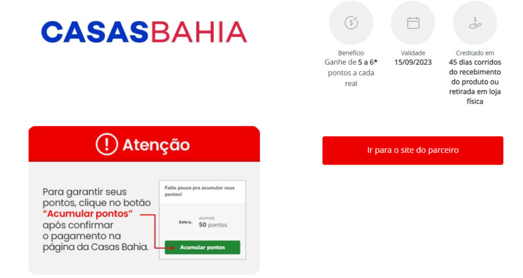 A promoção da Esfera oferece a chance de ganhar até 6 pontos por cada um real gasto na Casas Bahia. Esta promoção estará vigente até o dia 15 de setembro. Durante essa oferta, os pontos serão distribuídos da seguinte forma: