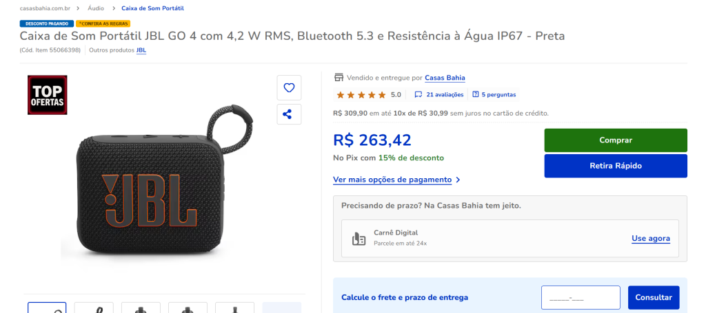 Dessa maneira, ao comprar uma Caixa de Som Portátil JBL GO 4 com 4,2 W RMS, Bluetooth 5.3 e Resistência à Água IP67, nas Casas Bahia, por R$ 263,42: