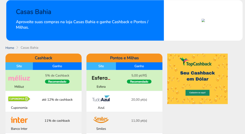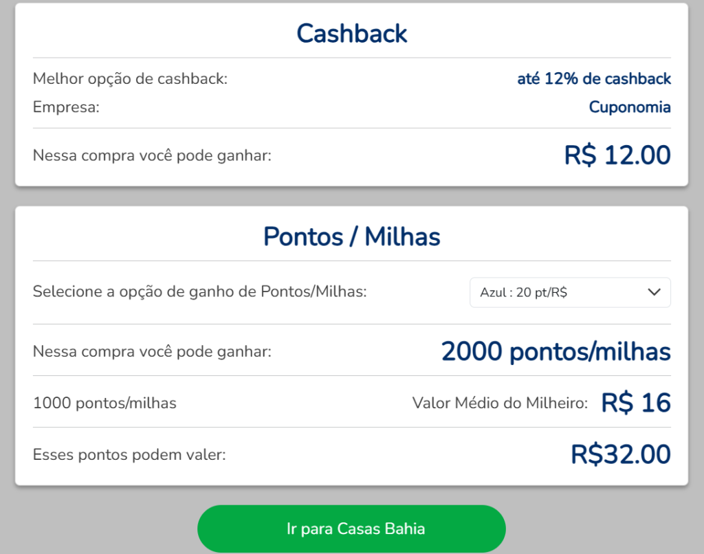Bom, vamos supor que você queira comprar um produto de R$ 100 na Casas Bahia. Porém, ao verificar as possíveis bonificações com a ajuda da Comparemania, você percebe que tem boas opções tanto de Cashback quanto de Pontos e Milhas, o que fazer?