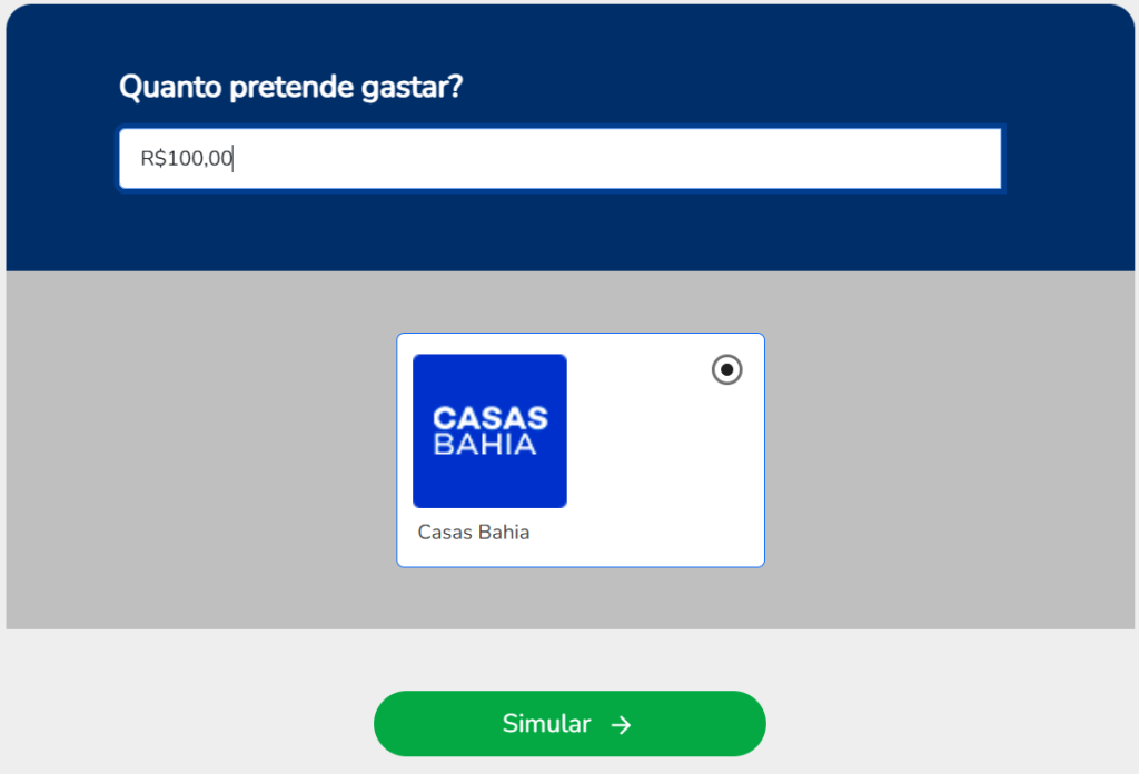 Nesse cenário, você gastaria R$ 100 na Casas Bahia e não está com tempo de calcular o seu benefício, contudo você ficou sabendo da Calculadora de ganhos e resolve testar.