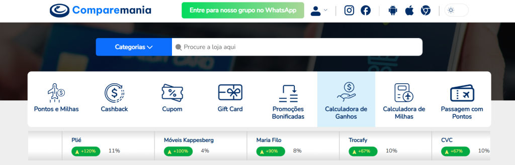 O primeiro passo para utilizar a Calculadora é entrar na Comparemania e selecionar “Calculadora de Ganhos” no menu.