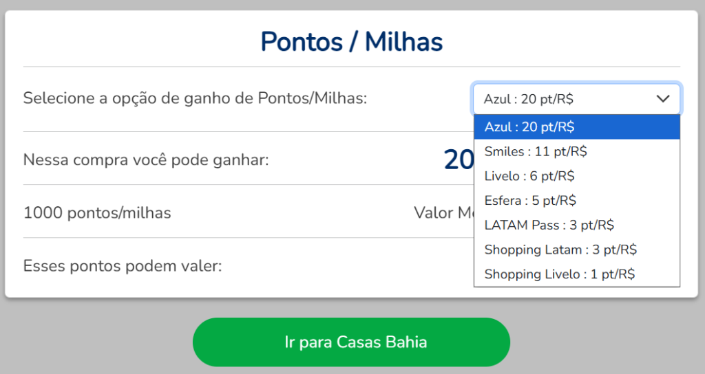 OBS: É importante salientar que, no caso dos pontos, é possível alterar a opção de programas de fidelidade, oque pode alterar a bonificação.