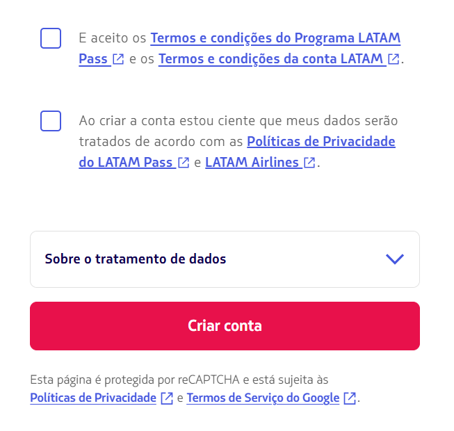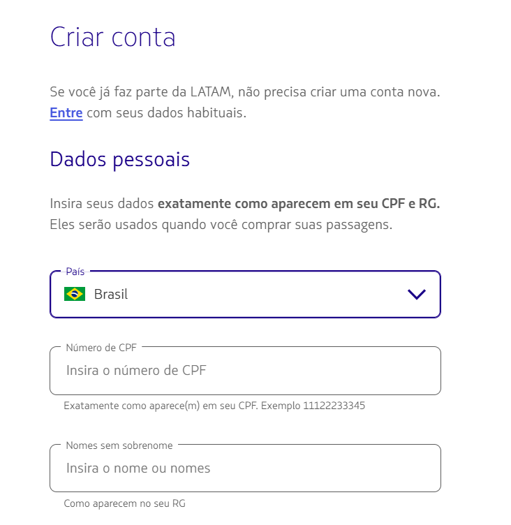 Entre em: https://www.latamairlines.com/br/pt/ - Preencha seus dados pessoais