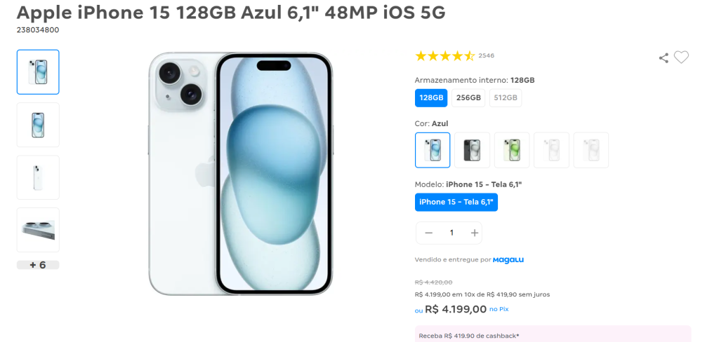 Vamos supor que você queira comprar um celular novo. Em princípio, você acessa o site da Magazine Luiza e encontra o celular que você queria, um Apple iPhone 15 128GB 6,1″ 48MP Azul, por R$ 4.199,00. Você adiciona o produto ao carrinho e finaliza o pagamento com seu cartão de crédito.