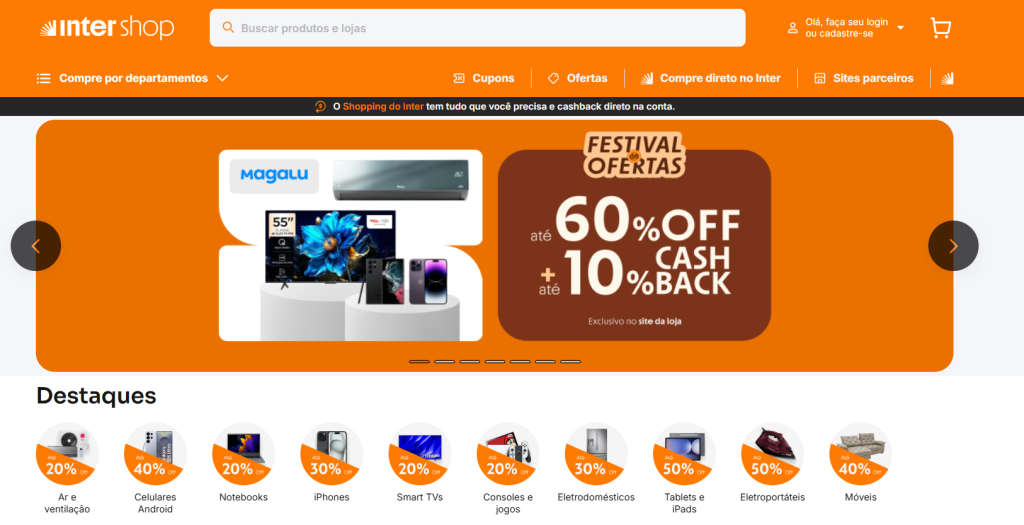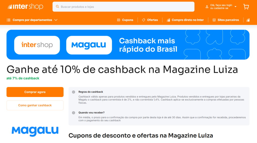 Dentro do aplicativo, você encontra o Inter Shop, onde é possível garantir cashback. Você navega e encontra a Magazine Luiza com uma oferta de 10% de cashback.