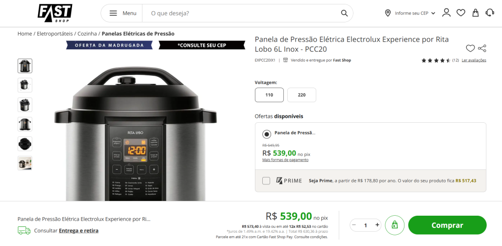 Vamos supor que você queira comprar uma panela elétrica para facilitar o seu dia a dia na cozinha. Então você se decide e quer uma Panela de Pressão Elétrica Electrolux Experience por Rita Lobo 6L Inox, na Fast shop.