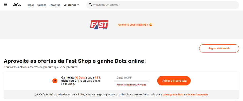 Porém, imagine que antes de realizar a compra, você decide dar uma olhada no Dotz, e descobre que a Fast Shop está oferecendo 10 Dotz a cada real gasto, ou seja, 10% de Cashback.