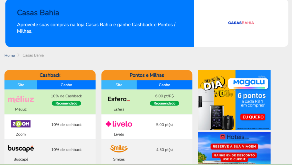 - 3. Procure a loja parceira: Ademais, use a barra de busca para encontrar a loja que deseja, como a Casas Bahia, e clique na oferta de cashback.