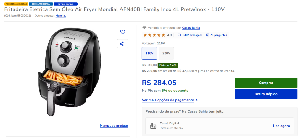 Vamos supor que você queira comprar uma Fritadeira Elétrica, a famosa Air Fryer. Em princípio, você acessa o site da Casas Bahia e encontra o modelo que queria, uma Fritadeira Elétrica Sem Óleo Air Fryer Mondial AFN40BI Family Inox 4L, por R$ 284,05. Você adiciona o produto ao carrinho e finaliza o pagamento com seu cartão de crédito.