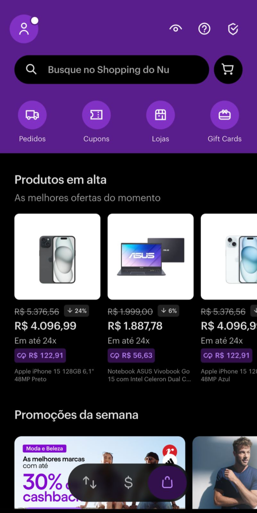 - 2. Entre no Nubank Shopping: Em seguida, procure pelo ícone do “Shopping” (geralmente uma sacola de compras) na parte inferior da tela.