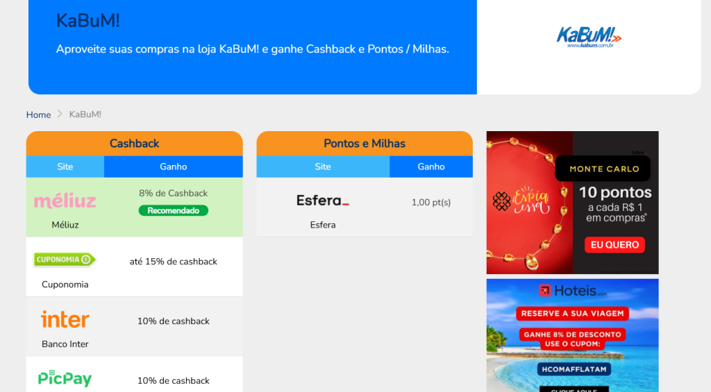 Dentro do aplicativo, você encontra diversas promoções de cashback. Você percebe que há uma oferta de 10% de cashback para o site da KaBuM!