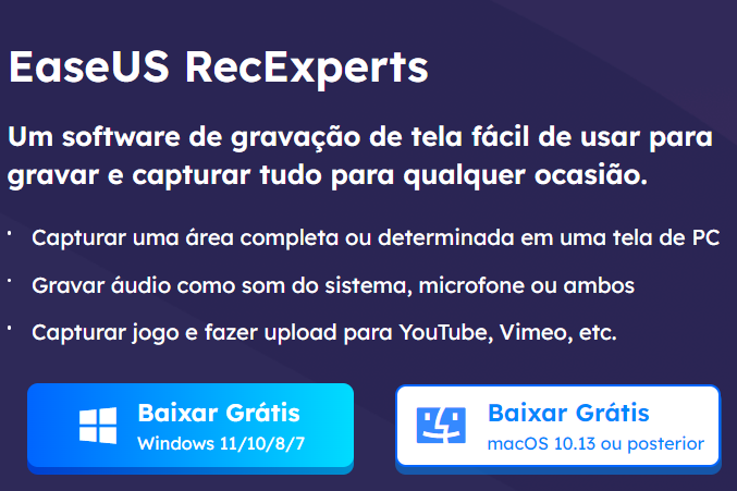 Caso seu computador esteja desatualizado ou por algum motivo não possua as funções citadas anteriormente, é possível contornar essa situação. Nesse sentido, você pode instalar um aplicativo externo para gravar a sua tela. Além disso, existem muitos apps do tipo disponíveis no mercado. No entanto, nós trouxemos aqui o EaseUS como uma opção recomendada.