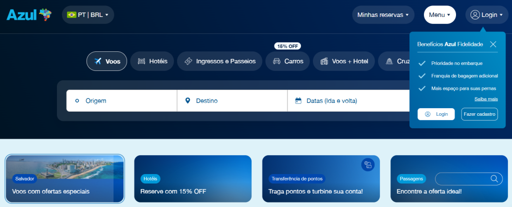 - Clube TudoAzul: receba pontos todos os meses e tenha acesso antecipado a promoções exclusivas com bônus maiores.