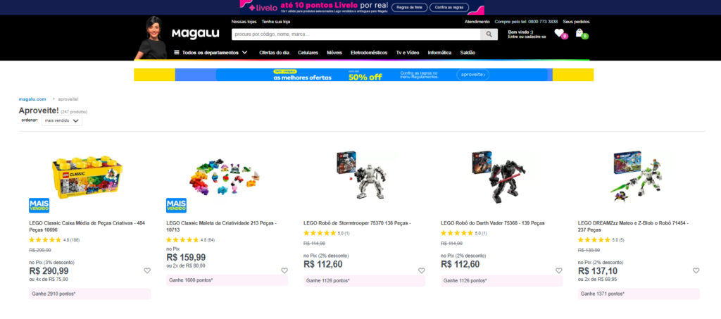 Navegue pelo site do Magalu e escolha os produtos que deseja comprar, nesse caso os selecionados LEGO. Certifique-se de que esses produtos sejam vendidos e entregues pelo Magalu para serem elegíveis para o acúmulo máximo de pontos Livelo.