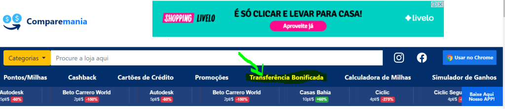 Quando você acessa o site da Comparemania, identifique o novo menu transferência bonificada, ele fica visível tanto no desktop quanto no mobile. A partir desse momento é apenas você clicar e ficará sabendo de todas as promoções do dia. Para melhor te ajudar na identificação, segue abaixo uma imagem: