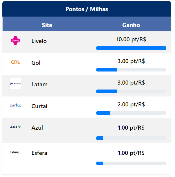 No menu “Ganhe Pontos”, acelerar o acúmulo de pontos é muito fácil! Neste menu você possui um marketplace completo com os principais varejistas do país e, ao comprar produtos nesta categoria, além de acumular os pontos gerados pela fatura do seu cartão, você vai acumular na pontuação bonificada*, além de ter acesso a resgate de vouchers de crédito no UBER, Vale Combustível, Ifood, Netflix e Spotify, resgate de Cashback na fatura, acesso a Sala VIP do aeroporto de Brasília e transferência de pontos para parceiros do programa como Latam Pass, Smiles e Tudo Azul.