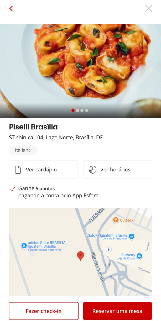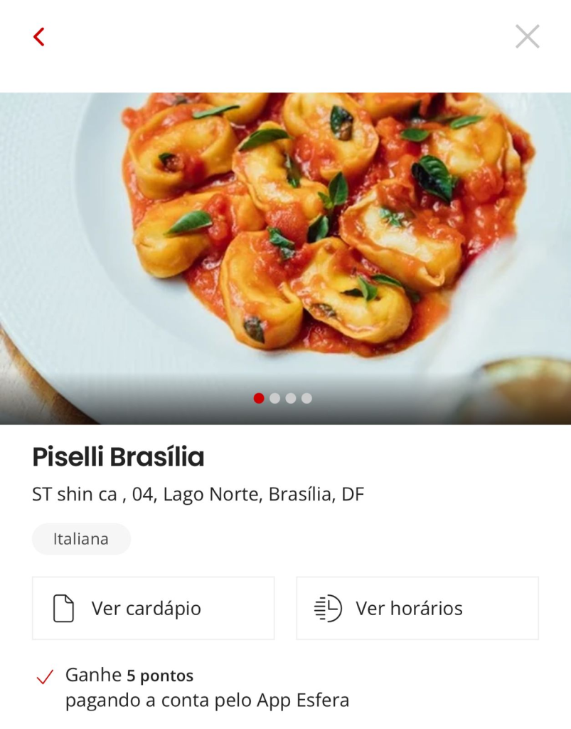 Vamos supor que você reservou uma mesa em um restaurante italiano, o Piselli Brasília. O valor da conta deu R$ 250,00, e o restaurante estava com uma parceria de 5 pontos a cada real gasto.