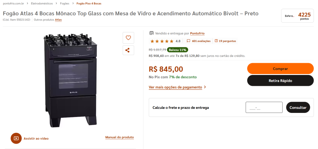Dessa maneira, ao comprar uma Fogão Atlas 4 Bocas Mônaco Top Glass com Mesa de Vidro e Acendimento Automático Bivolt, no Ponto Frio, por R$ 845,00: