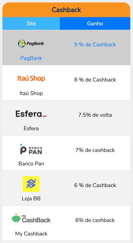 Após a confirmação do pagamento da compra, o sistema calculará automaticamente o valor do cashback, que ficará disponível na sua conta do programa de cashback escolhido, por exemplo nesse caso foi o PAGBANK, que está localizado na lista de programas no site da Comparemania.