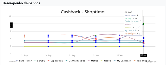 Para a data de hoje, o nosso comparador indica que a melhor opção para ganhar cashback é no Banco Inter, que te dá 8% do seu dinheiro de volta nas compras no Shoptime. Além disso, é possível conferir em nosso gráfico outras empresas que também dão cashback. Veja nosso gráfico: