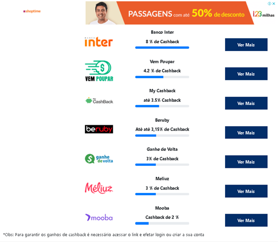 Em nosso site você visualiza todas as opções de empresas que dão cashback e pode escolher que te dá mais retorno de cashback. Além disso, é possível visualizar outras lojas que também dão cashback.
