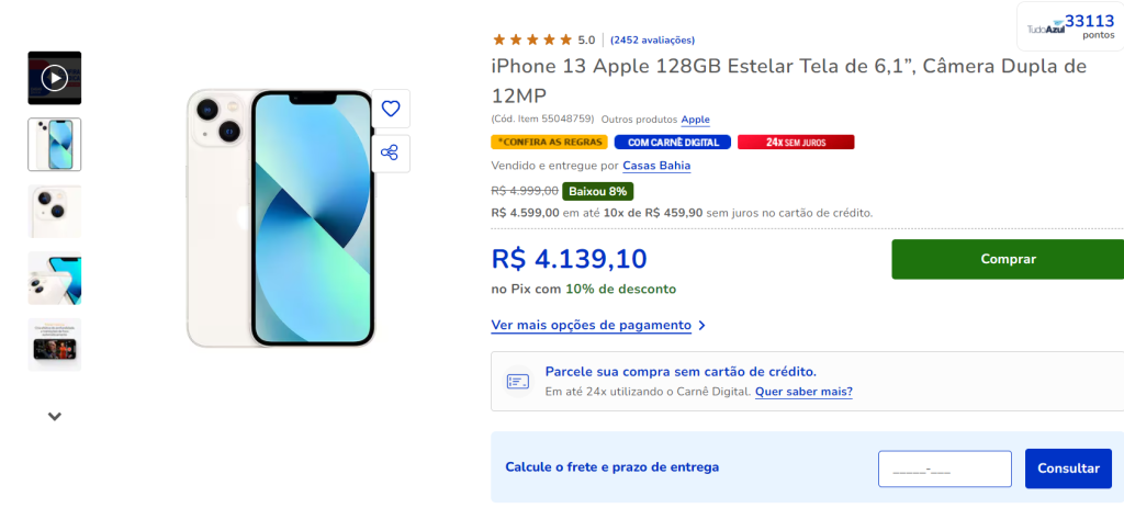 Ganhe até 8 pontos por real gasto (no caso de não assinante do Clube TudoAzul), totalizando 33.113 pontos com a compra de um iPhone 13.
