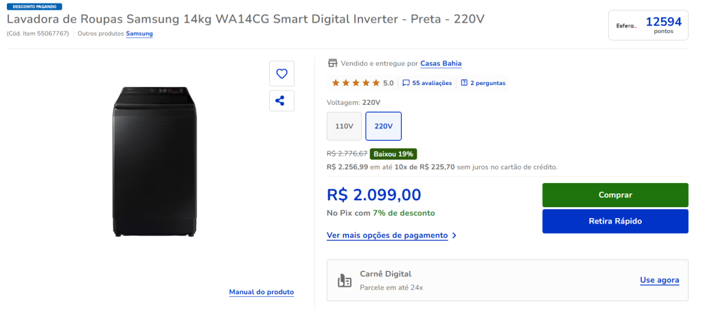 E com essa promoção de 6 pontos a cada real gasto é possível comprar uma Lavadora de Roupas Samsung 14kg