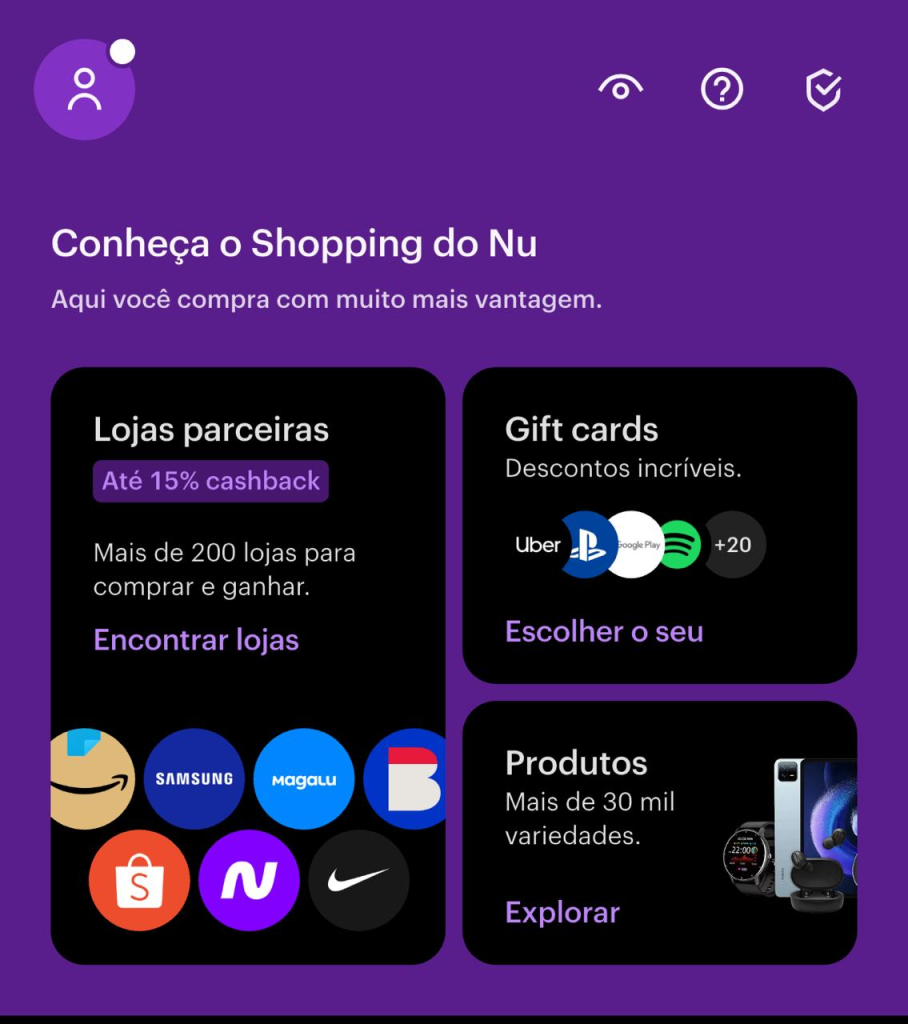 O Nubank também oferece cashback por meio de parcerias no seu app. Desse modo, ao acessar a área de “Shopping”, você encontra diversas lojas online que oferecem dinheiro de volta para compras feitas pelo link do Nubank. É só clicar, comprar e receber o valor diretamente na conta.
