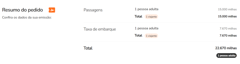 - Escolha os métodos de pagamento, por exemplo, “Milhas + Dinheiro” ou o pagamento das taxas.