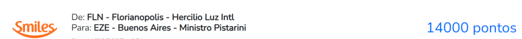 Por exemplo, a passagem de avião de FLN – Florianopolis – Hercilio Luz Intl para EZE – Buenos Aires – Ministro Pistarini.