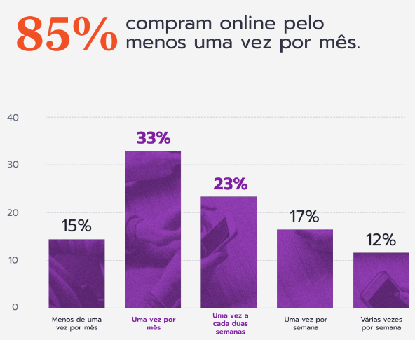 Nesse sentido, a Octadesk em conjunto com a Opinion Box realizaram a pesquisa “E-commerce Trends 2024“. Nessa pesquisa, é possível ver diversos dados sobre compras online, um dos dados evidência que 85% dos usuários realizam pelo menos uma compra online por mês. Venha você também realizar compras online e desfrutar desses benefícios citados anteriormente.