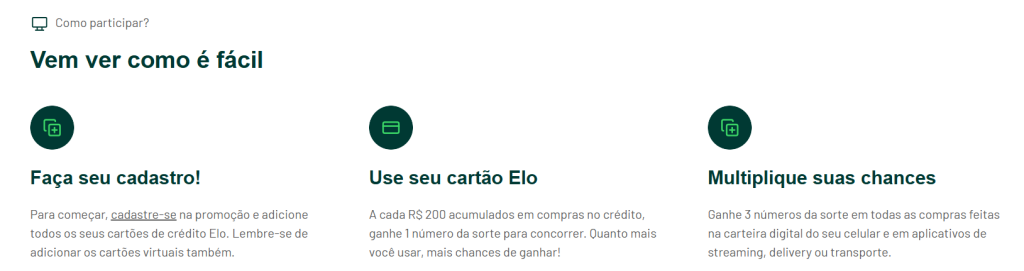 Você apenas direciona seus pagamentos para o cartão Elo cadastrado e pronto — já está concorrendo.